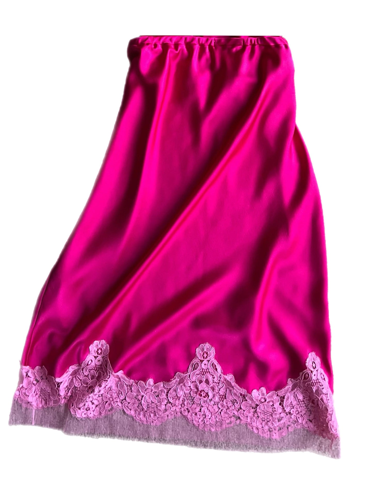 Elevate your style with this silk midi skirt, sitting gracefully on the waist for a flattering silhouette. Adorned with Alençon lace, the "Queen of Laces," it exudes luxury. Perfectly paired with loafers or slingbacks, complete the look with a matching silk camisole for effortless chic.