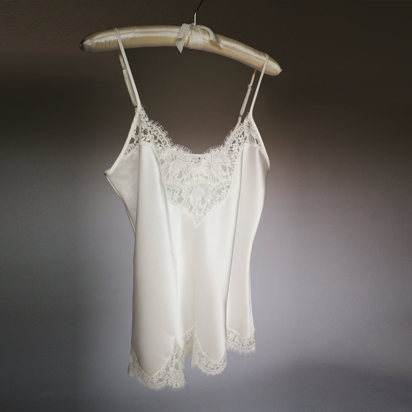 Natalie's iconic bias-cut silk camisole has been handmade with careful attention to detail. The beautiful drape, the French lace and the craftsmanship make for a timeless addition to your lingerie collection.