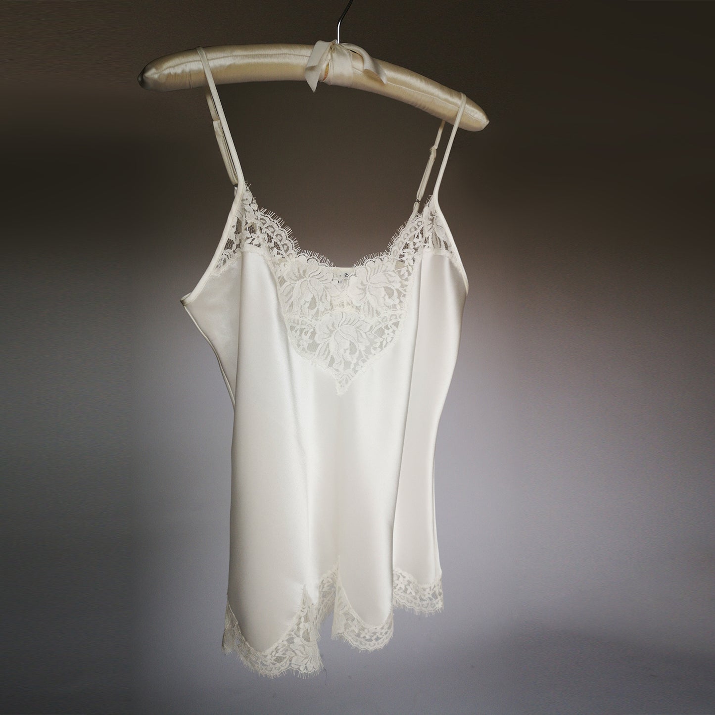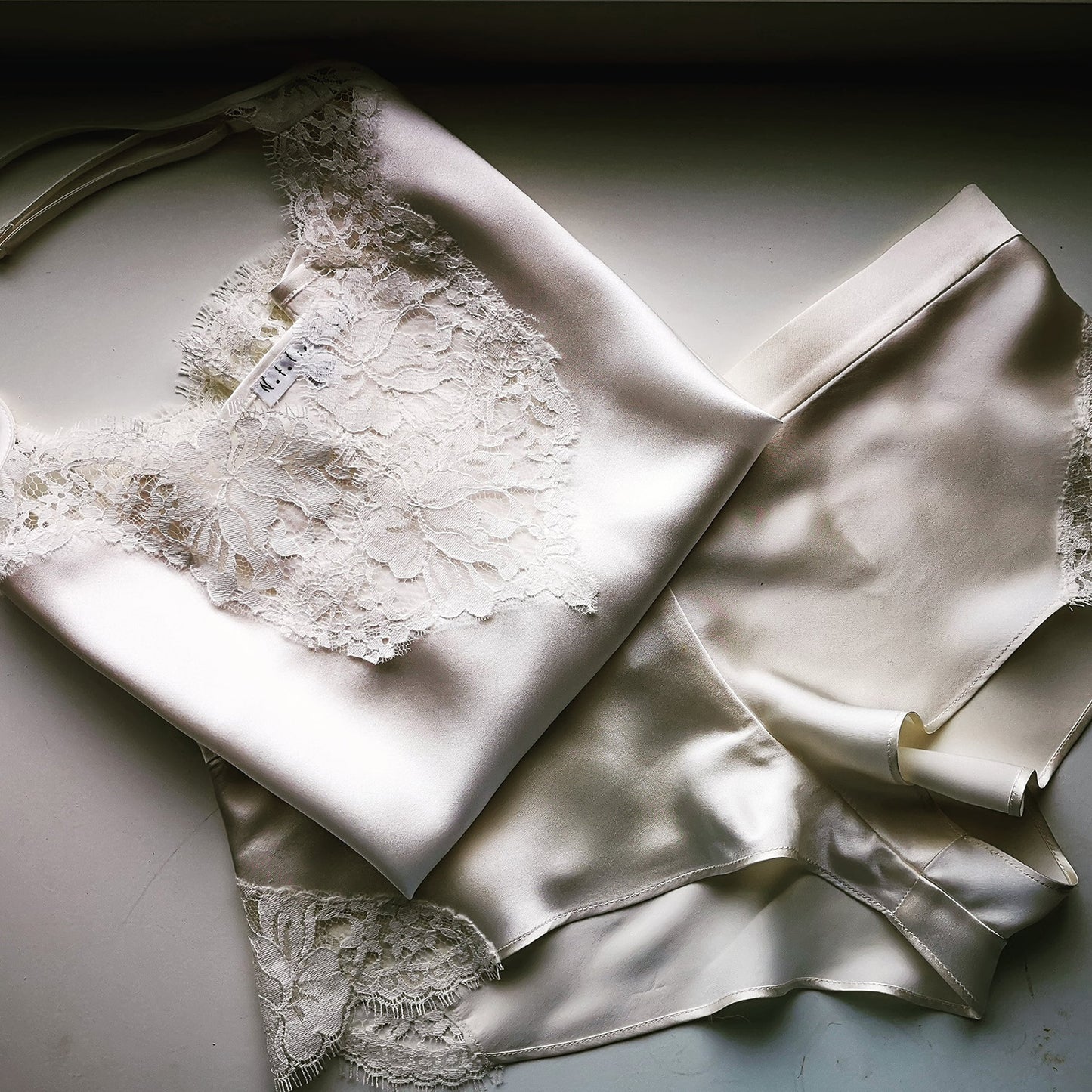 Natalie’s iconic bias-cut silk camisole, elegantly paired with French knickers, exudes timeless sophistication. Crafted with impeccable attention to detail, its fluid drape, delicate French lace, and expert craftsmanship make it a luxurious addition to your lingerie collection.